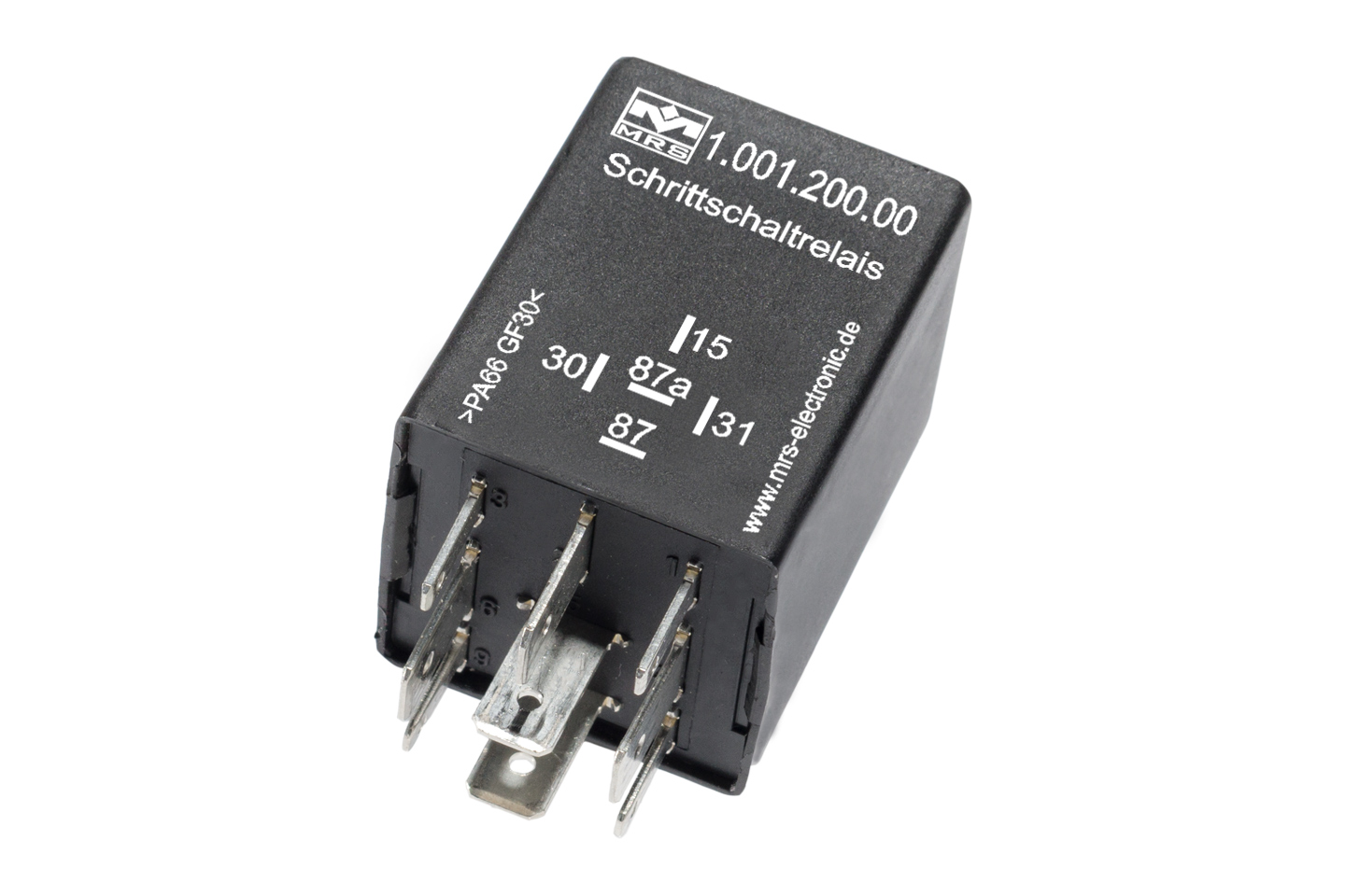Anwendungsbereich von Schrittschaltrelais ist das Ein- und Ausschalten von Verbrauchern über Tastbetrieb. Mit dem Schrittschaltrelais kann ein Verbraucher über einen Taster geschalten werden. Wird an Klemme 15 ein Impuls detektiert, schaltet das Relais und hält sich selbst. Mit einem weiteren Impuls wird wieder geschalten. (Stromstossschalter bzw. Toggle Flip-Flop). Die Klemme 15 ist entprellt. Gehäuseformen finden Sie im Kapitel Gehäuse und Grundkörper. Diese Schrittschaltrelais sind nicht programmierbar.